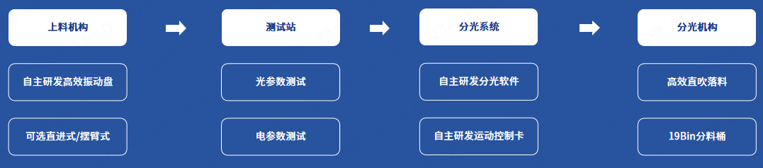 标谱半导体自主研发的快速分光机是专为贴片式LED设计的光电测试分选一体化设备。设备内置标谱自主研发的控制系统,由高速振动盘实现材料高效自动上料,根据材料特性可灵活选择直进式或者摆臂式上料方式,通过相应组件将材料快速从导轨转移至分度盘上。分度盘精密转位系统驱动物料依次完成定位校准、光电参数同步检测、智能分选及NG剔除等工序,最终基于光学特性参数实现BIN级精准分选。设备标配19bin分料桶,搭载自主研发的高精度分光系统,产能可达100K/H。人性化操作界面配合智能校准功能,显著提升设备易用性。
