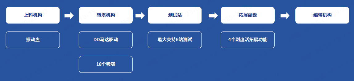 转塔式分选机由DD马达驱动主转塔旋转以及主转塔上可以独立上下运动的吸嘴,设备运营速度快,最高可达45K/H,重复定位精度≤10um;可检测1.0x1.0mm to 6x6mm尺寸范围的芯片;模块化设计使用设备可灵活定制和后期拓展测试站功能,维护也方便快捷,大大提高产能效率。