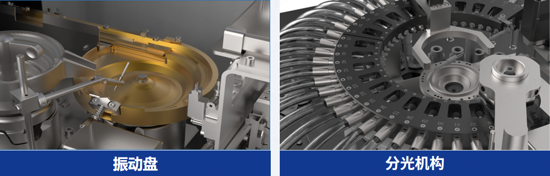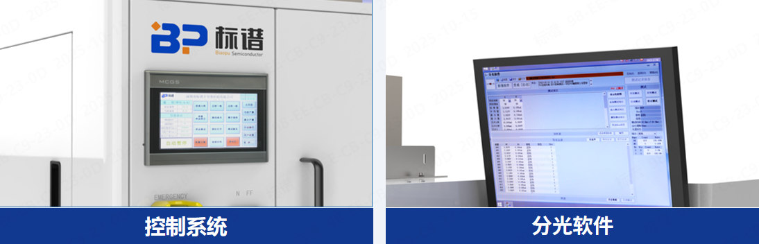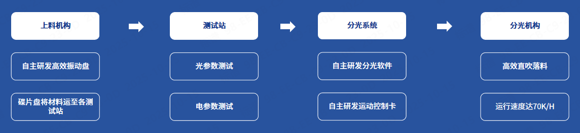 碟片式快速小材料分光机是由标谱自主研发的用于LED 0603等小尺寸产品测试分选的自动化设备。本机采用PLC控制系统,高速振动盘供料碟片过度到主转盘上,通过主转盘承载材料间歇旋转分别经过校正工位对材料进行修正、测试工位对材料进行夹持点亮测试材料光学数据和电特性数据进行分类,由电磁阀控制吹气的方式快速将材料吹离主转盘到指定的料筒内。设备稳定高效、运行速度达70K/H,故障次数≤4次/H,检测精度提升至XY±0.001,能够满足大多数封装企业对小材料产能提升的要求。