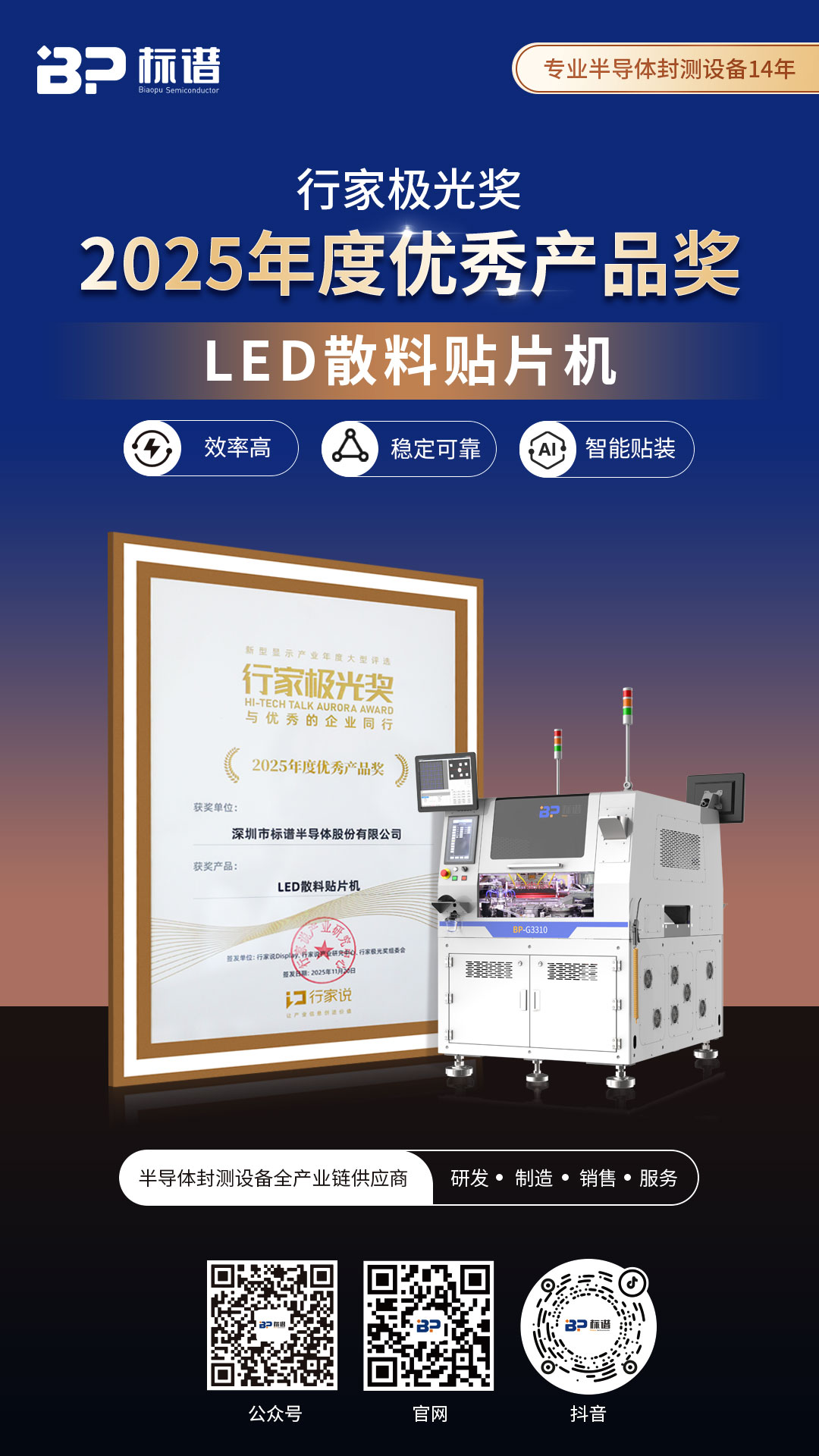 深圳市标谱半导体股份有限公司(以下简称“标谱”)自主研发的LED散料贴片机凭借其高效、精准、创新的自动化贴装方案,成功斩获行家极光奖——2025年度优秀产品奖,彰显硬核品牌实力!