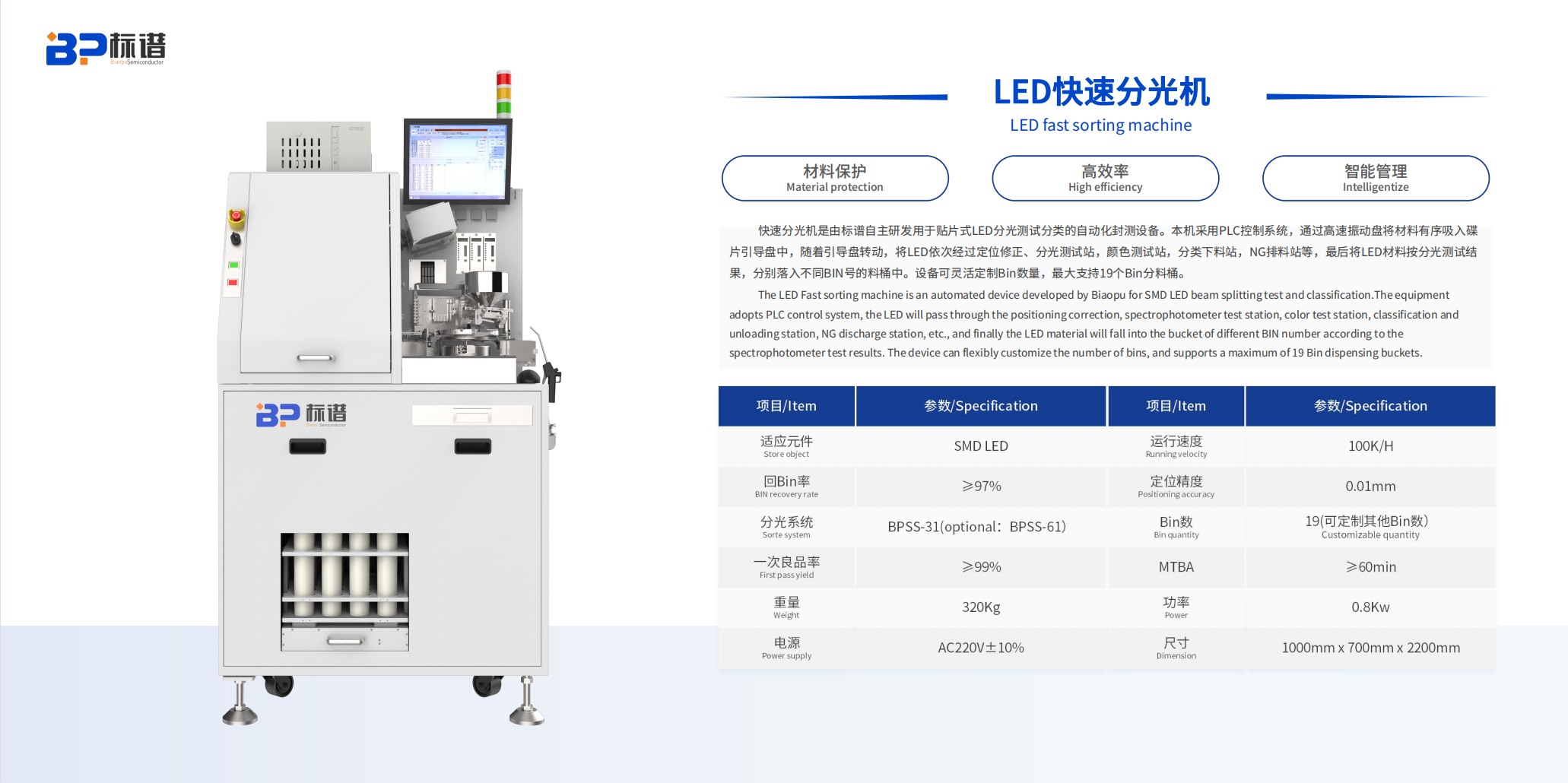 快速分光机通过集成高速振动盘、定位修正、分光测试站、颜色测试站等多个功能模块,实现了对电子元器件的自动供料、测试、分类和收集。它能够精确测量LED等元器件的光谱特性、颜色一致性等关键参数,并根据测试结果将元器件分类至不同的料桶中,以满足不同的生产需求。
