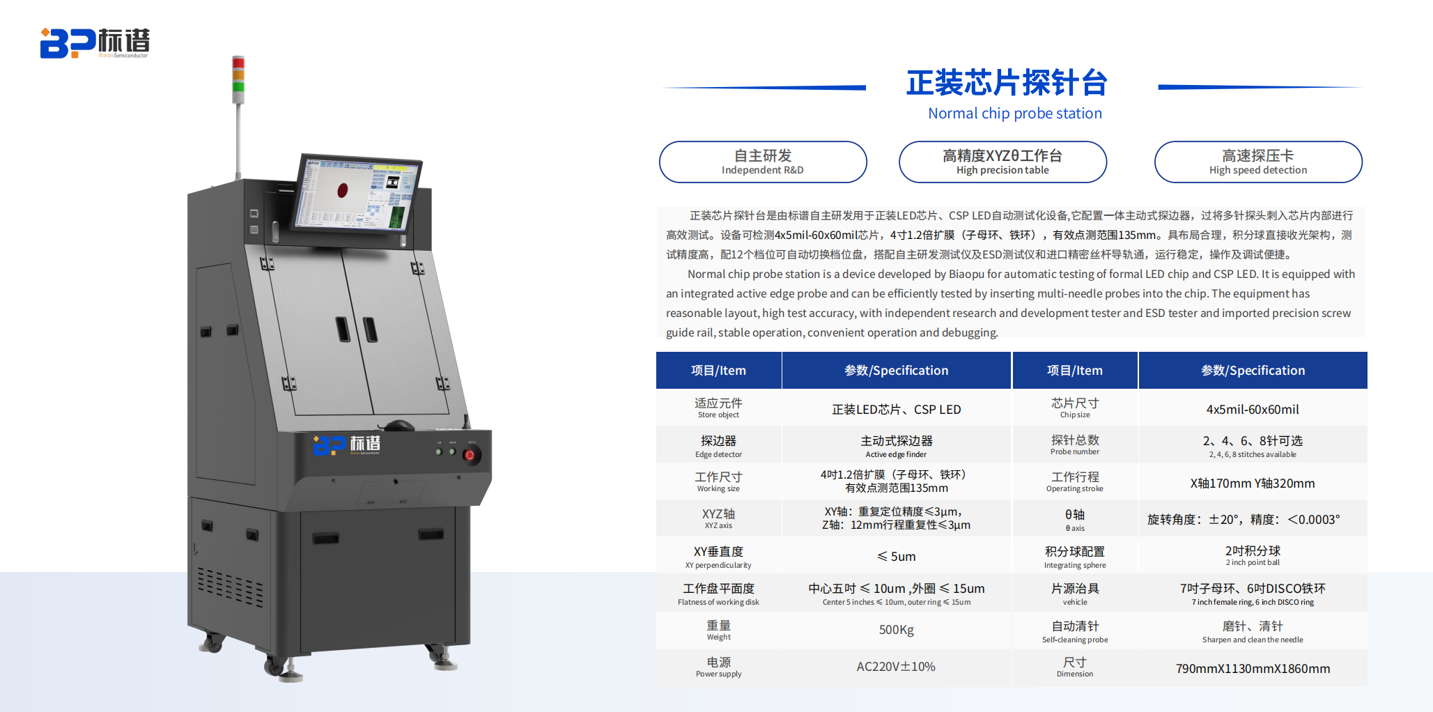 应用环境:在LED芯片的生产线上,正装芯片探针台通常作为关键的测试设备,对生产出的芯片进行批量、快速的测试,确保产品质量和生产效率。