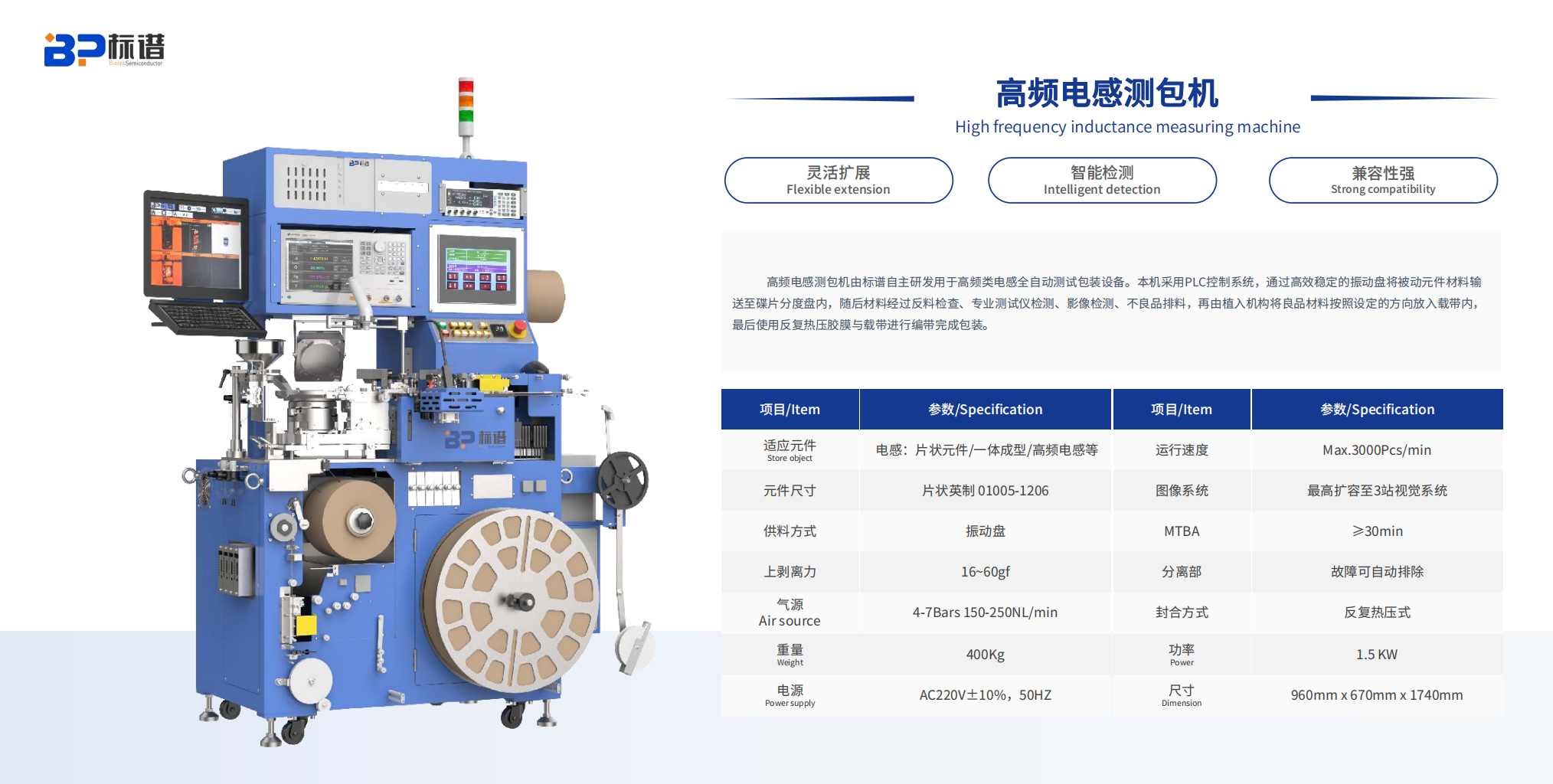 高频电感测包机主要用于高频电感的自动化测试与包装过程。它通过一系列精密的机械和电子设备,对电感进行高效、准确的测试和筛选,并将合格产品自动包装成标准卷带,以便于后续的生产和使用。