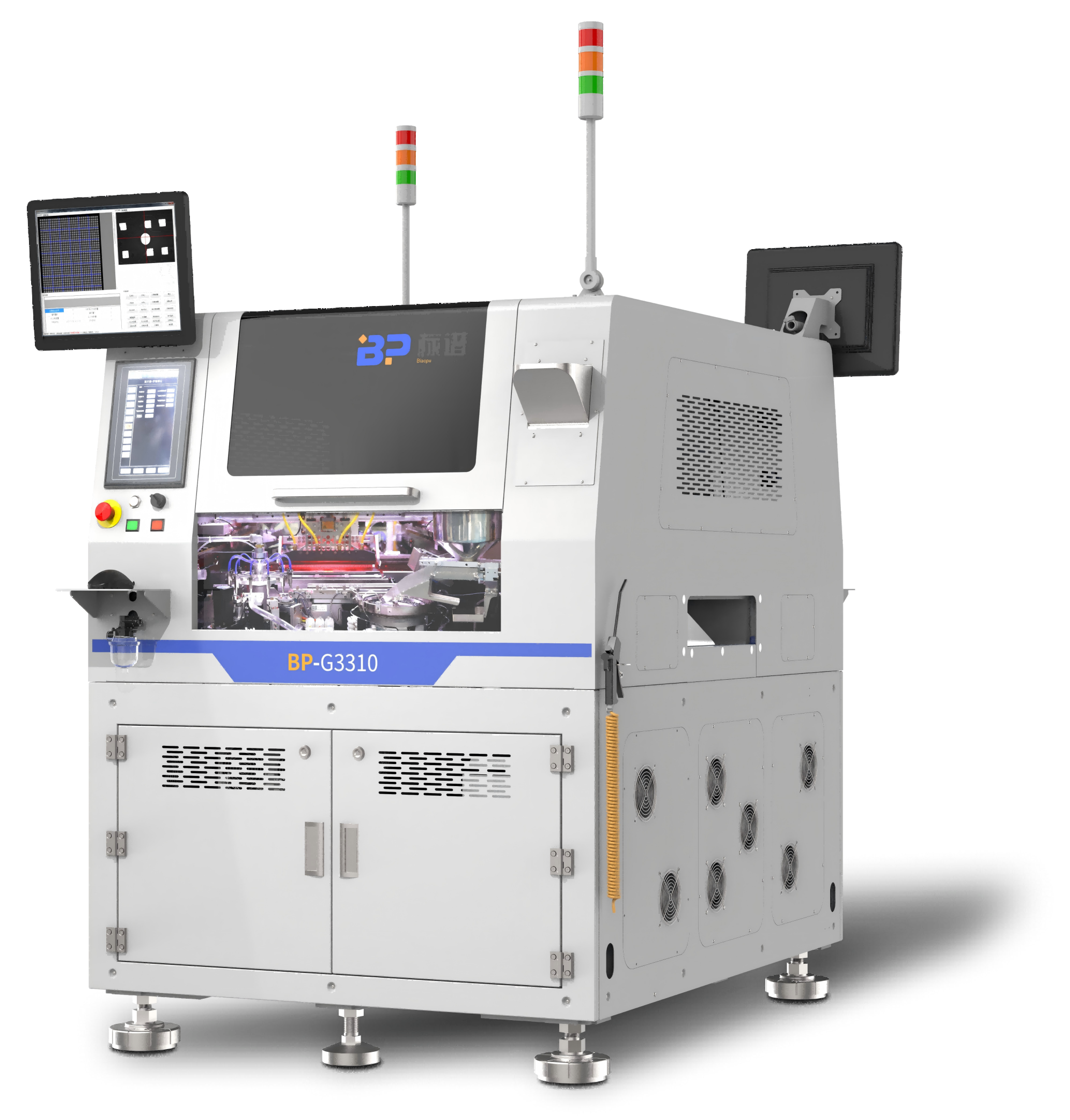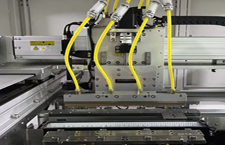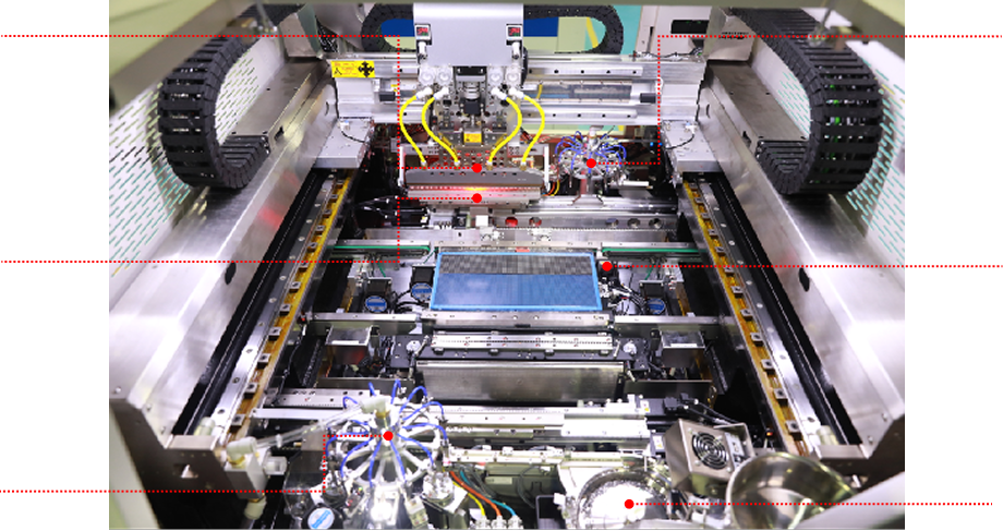 视觉精确定位,机械结构对PCB板进行角度修正,通过直线电机在X、Y、Z三个方向的高速移动来实现多产品高精度重复贴装。