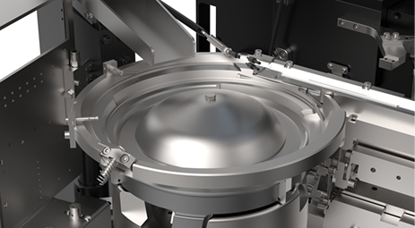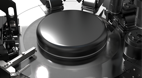 将材料通过真空和高压吸附到玻璃转盘上,使其整齐有序的排在同一运动轨迹上,保证拍照及吹气准确