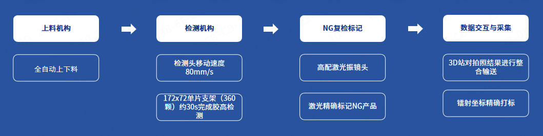 ①检测头移动速度80mm/s,172x72单片支架(360颗)约30s完成胶高检测,新开发算法降低延时提升效率