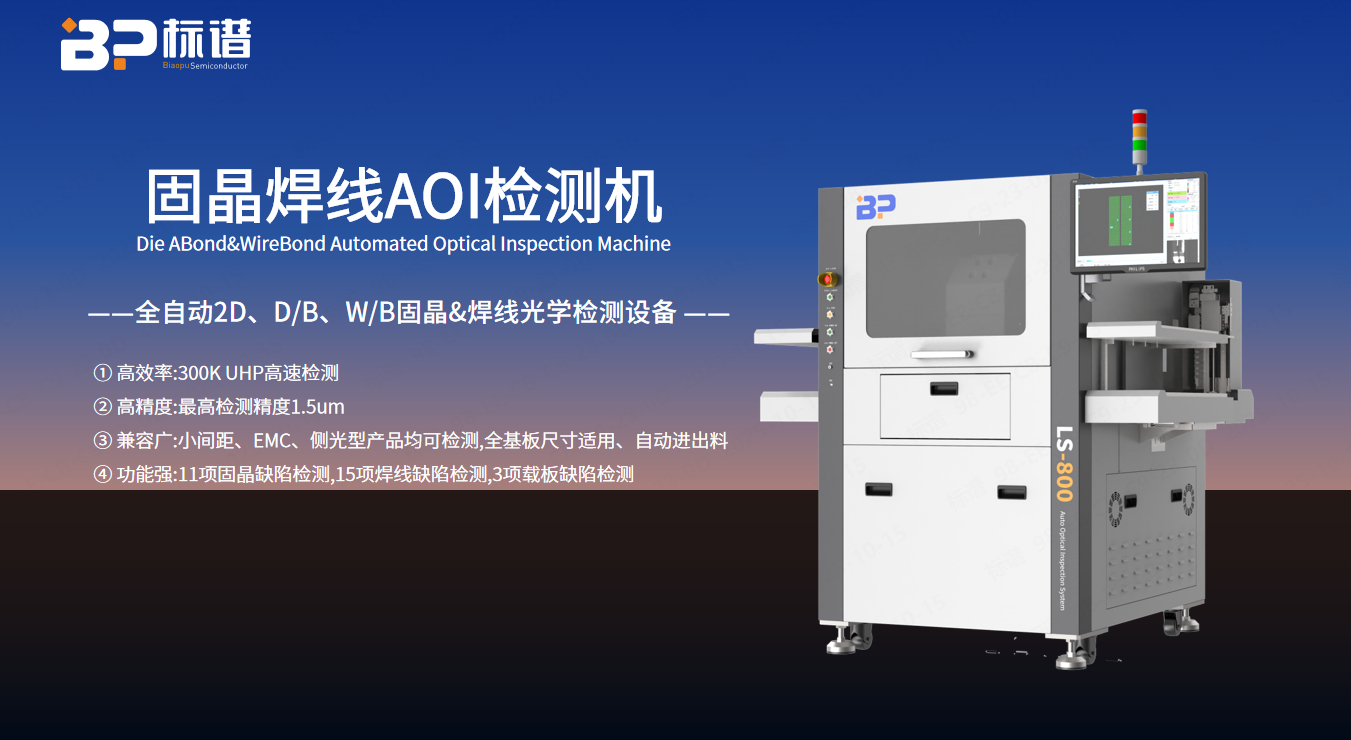 固晶焊线AOI检测机是由标谱自主研发用于检测固晶、焊线制程中出现的各类缺陷,该设备人机界面简洁友好,可全自动上下料,操作员能快速上手,大大节约时间与人力成本。拥有1.5um的高解析视觉系统,可检测11项固晶缺陷类别,15项焊线缺陷类别以及3项载板缺陷类别。